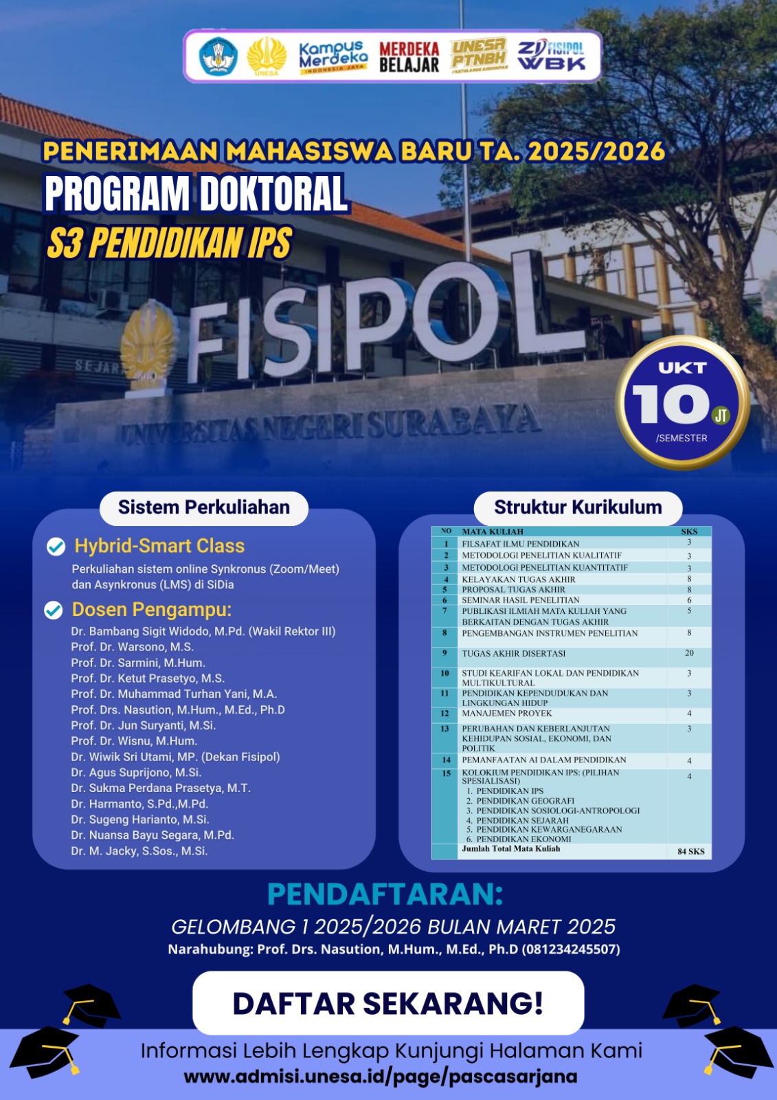 Penerimaan Mahasiswa Baru Program Doktor (S-3) Pendidikan IPS Universitas Negeri Surabaya Tahun Akademik 2025/2026